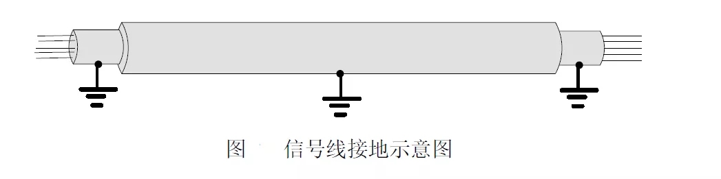6、信號線為屏蔽電纜線,屏蔽層應(yīng)有良好絕緣,不可與機架、柜體發(fā)生摩擦、打火,屏蔽層兩端及中間均需做接地連接(見下圖)。