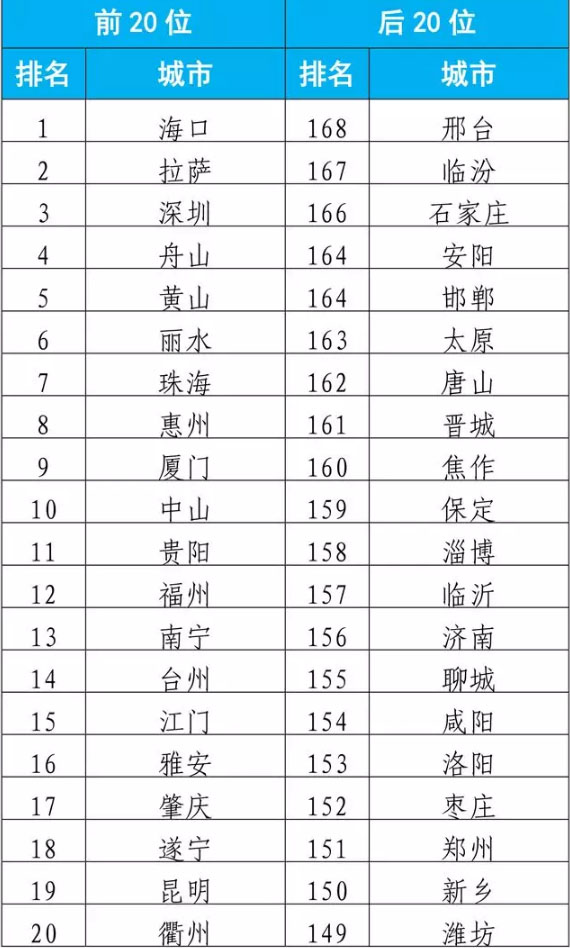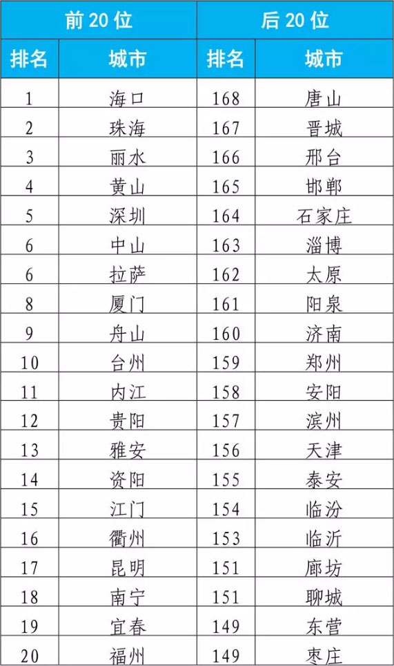 2019年7月,168個重點城市中唐山、晉城、邢臺市等20個城市空氣質(zhì)量相對較差(從第168名到并列第149名);???、珠海、麗水市等20個城市空氣質(zhì)量相對較好(從第1名到第20名,見附表1)。